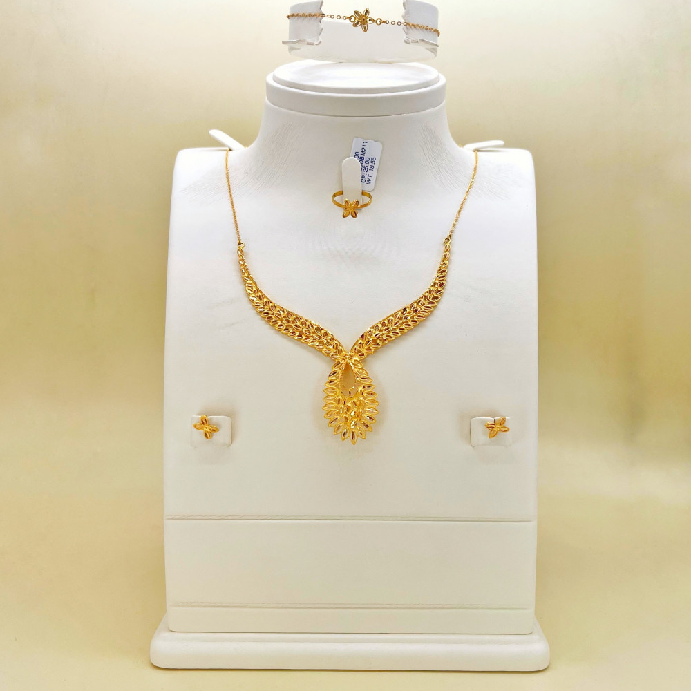 سيجعلك طقم الذهب المكون من قلادة وخاتم ساحر، وإسوارة وحلق أذن رائع تشعّين بالتفرد والتميز في أي مناسبة، فتصاميمه الهندسية البديعة من الذهب الخالص ستلفت الأنظار وتلامس قلوب الجميع. ستشعرين بالثقة والجمال، فهو يجمع بين الأناقة الكلاسيكية والتصميم العصري، مما يجعله مثالياً للمرأة العصرية التي تسعى للتميز في كل تفاصيل إطلالتها.احصلي على طقم الذهب الساحر من لؤلؤة الزهراء، واجعليه رمزاً لذوقك الرفيع وقوة شخصيتك، سيكون رفيقك المثالي في كل المناسبات، سواء كنتِ ترتدينه في لقاءات رسمية أو مناسبات خاصة.